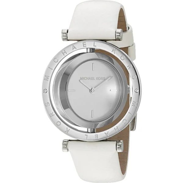 السعر الأصلي هو: 5.600 EGP.4.100 EGPالسعر الحالي هو: 4.100 EGP.ساعة مايكل كورس حريمي أصلية موديل (افير) Averi MK2524 بلون فضي و استيك جلد طبيعي بلون ابيض.