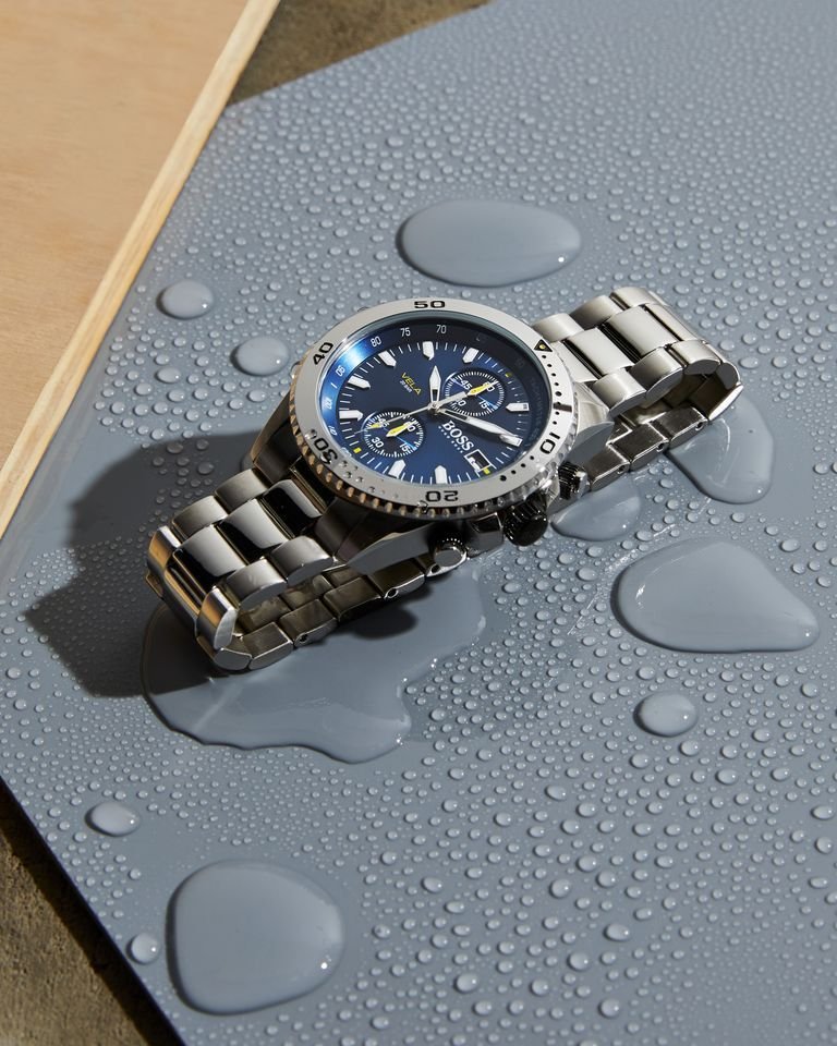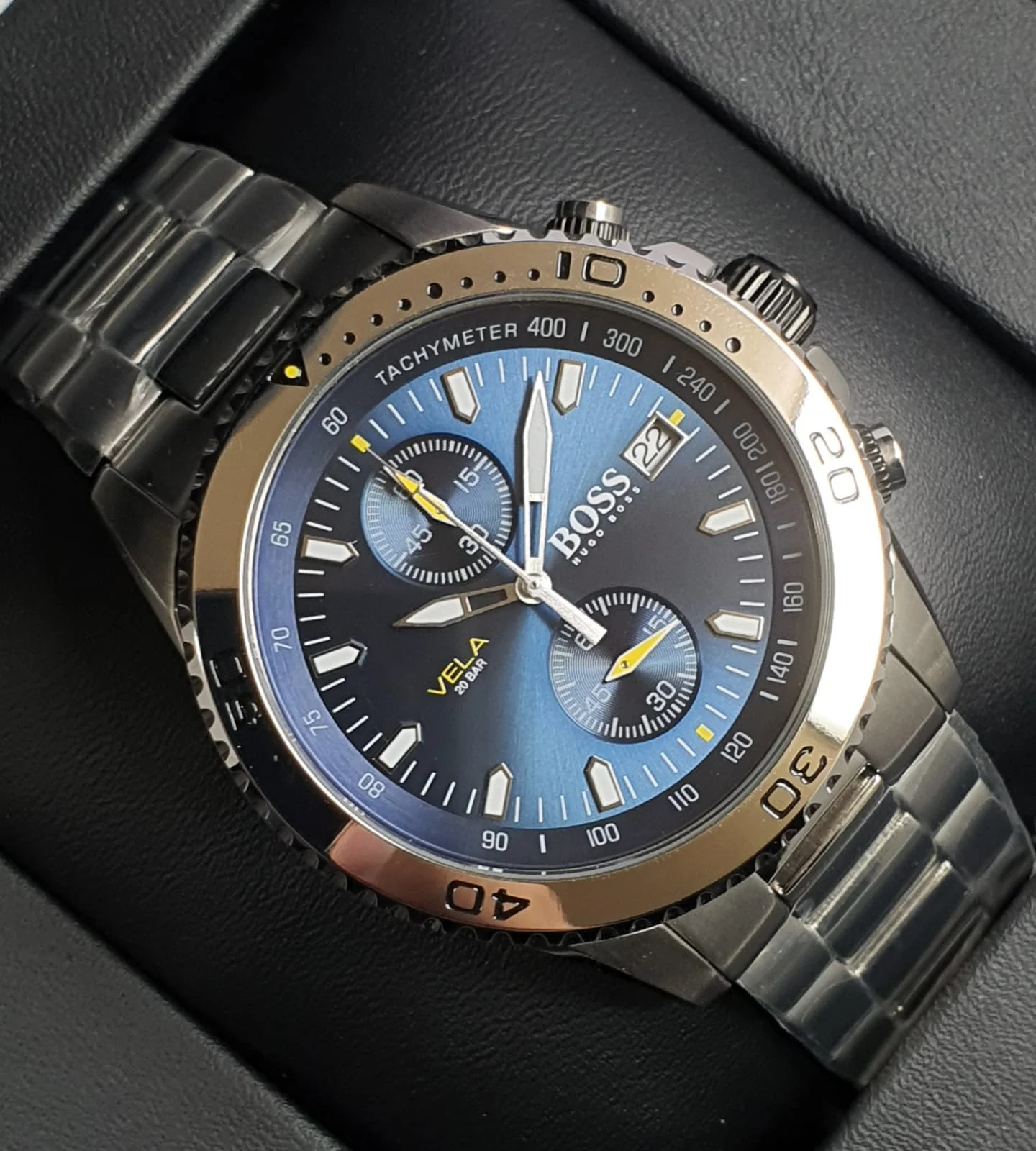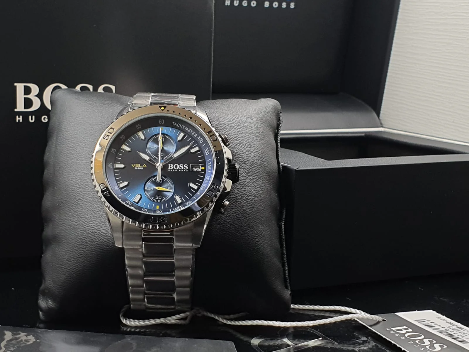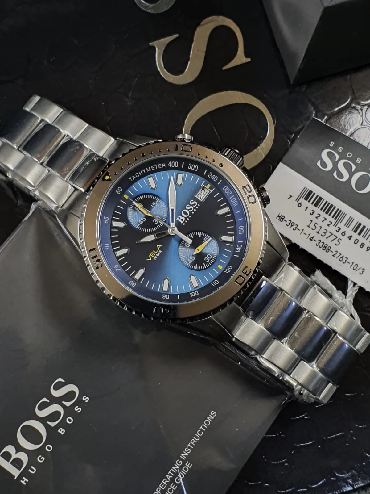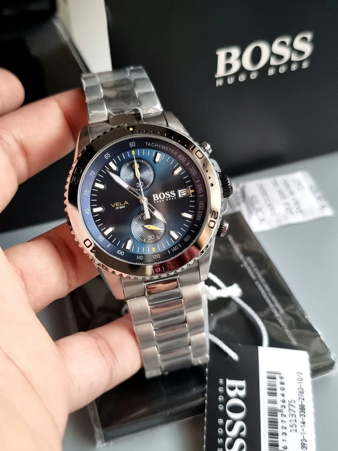 ساعة هوجو بوس للرجال أصلية موديل Vela 1513775 لون ازرق و استيك معدن ستانلس لون فضي.
