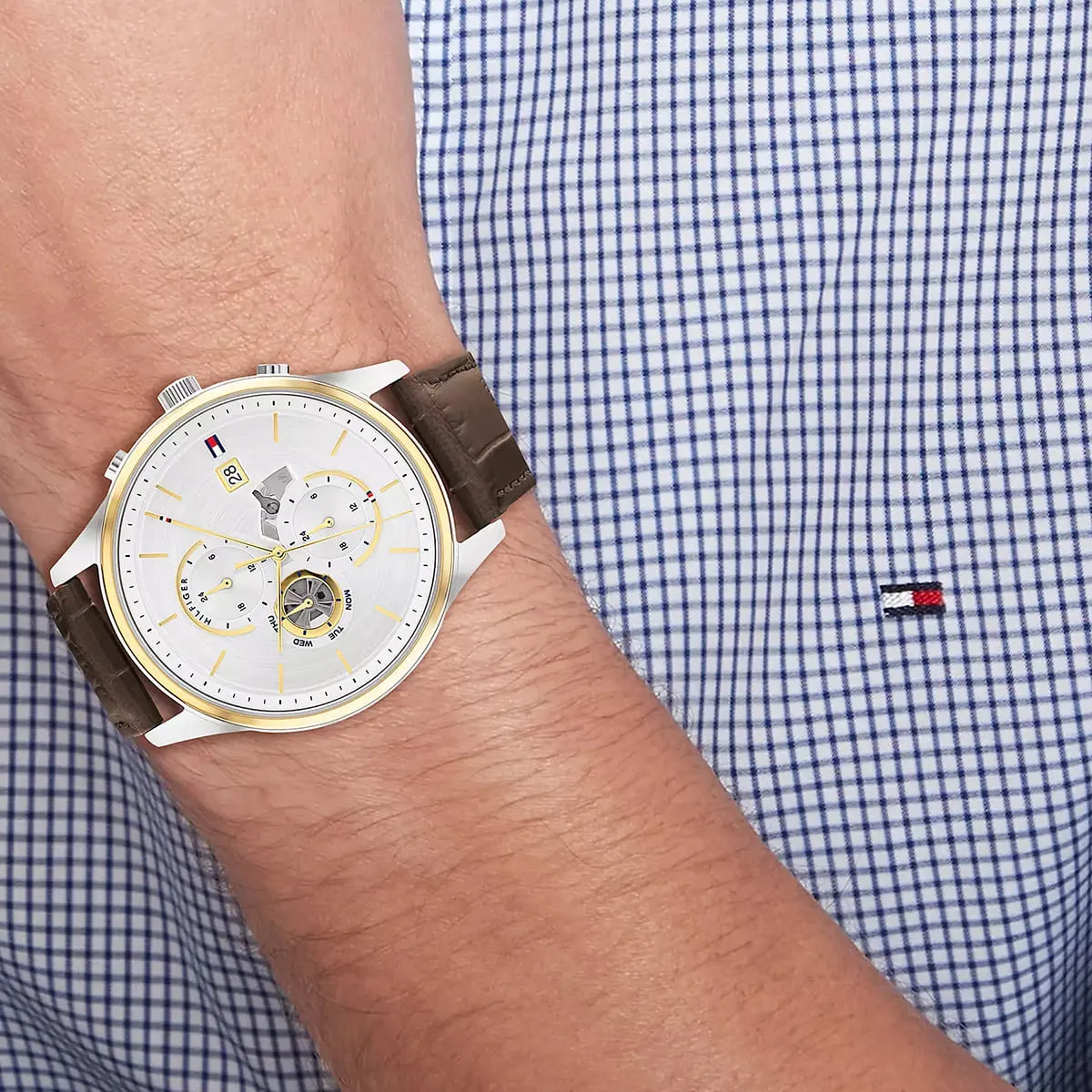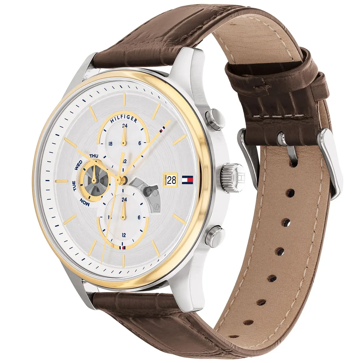 ساعة تومي هيلفيغر Tommy Hilfiger للرجال أصلية موديل 1710501 Weston لون فضي و استيك جلد طبيعي لون بني.