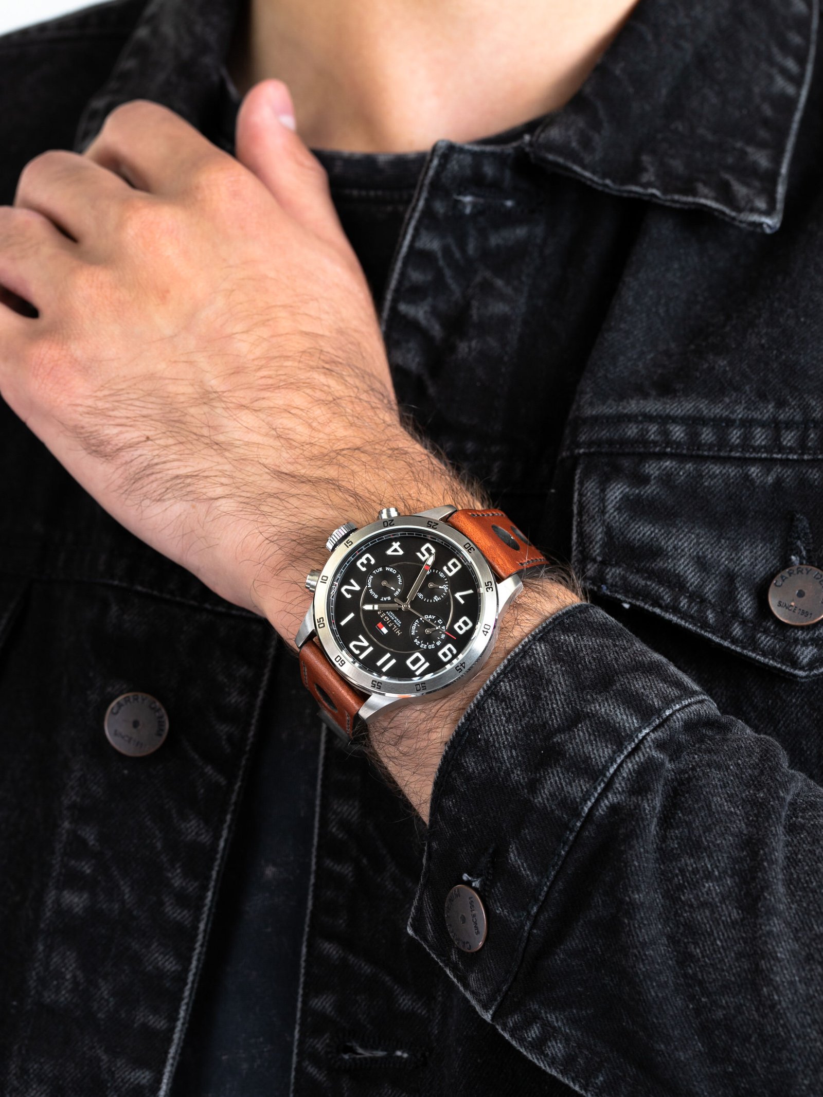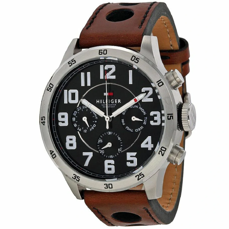ساعة تومي هيلفيغر للرجال اصلية موديل (ترينت) Trent 1791049 لون اسود واستيك جلد طبيعي لون بني.