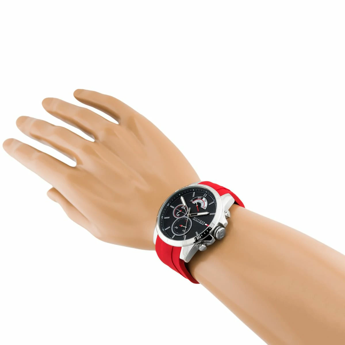 ساعة تومي هيلفيغر للرجال أصلية موديل (ديكر) Decker 1791351 لون اسود و استيك سيليكون مطاط لون احمر.