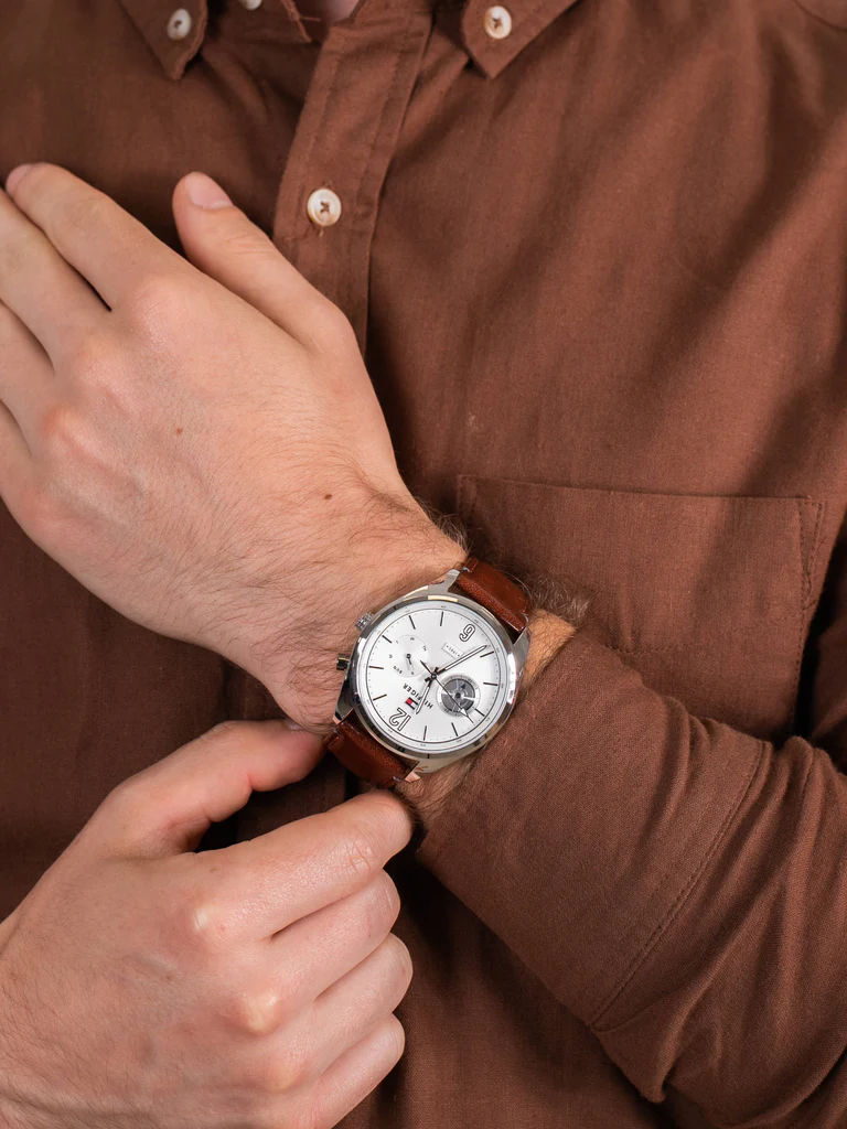ساعة تومي هيلفيغر أصليه للرجال موديل 1791550 بلون ابيض واوستيك جلد طبيعي بلون بني