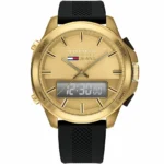 ساعة تومي هيلفيغر Tommy Hilfiger للرجال أصلية موديل 1791762 Jeans لون ذهبي و استيك سيليكون مطاط لون اسود.