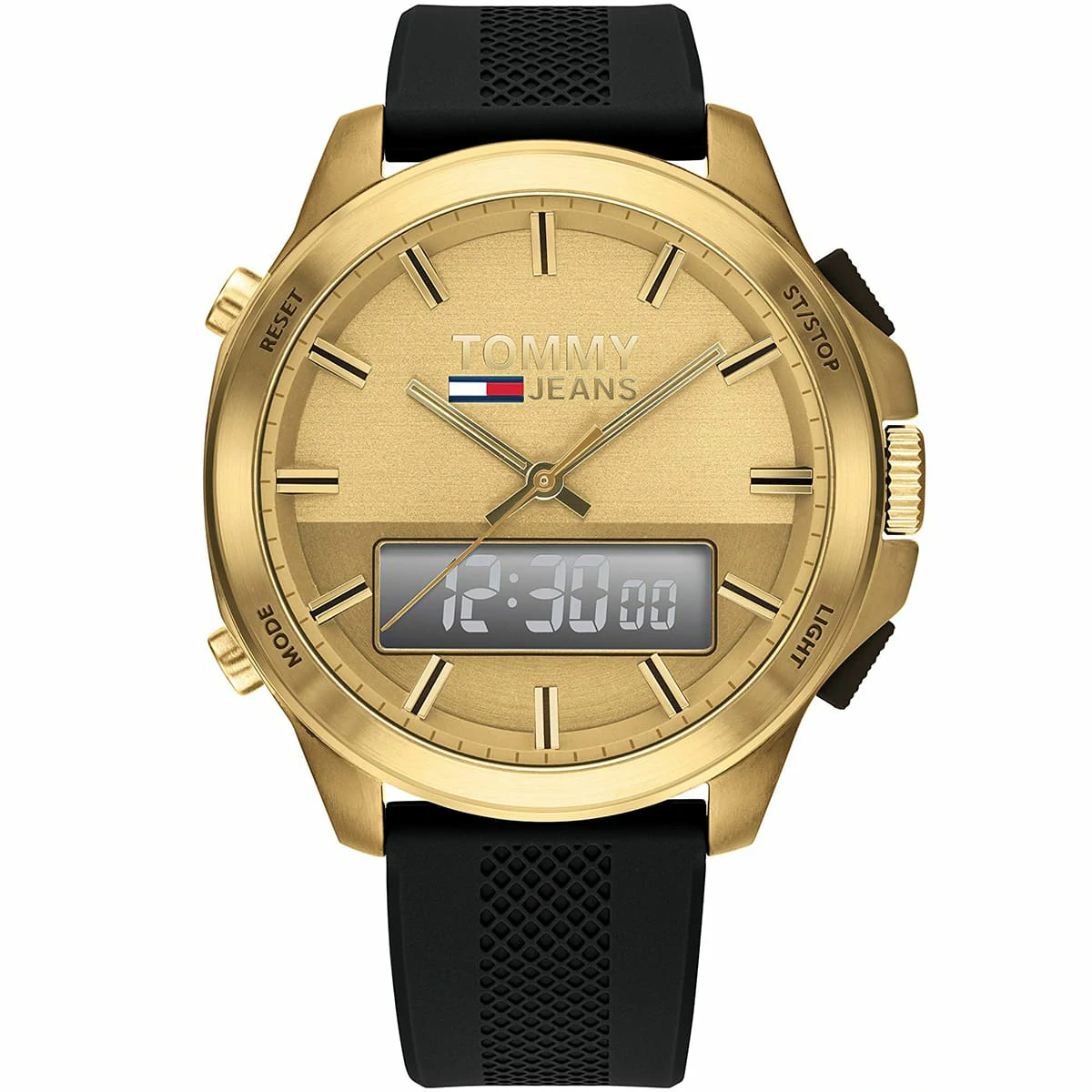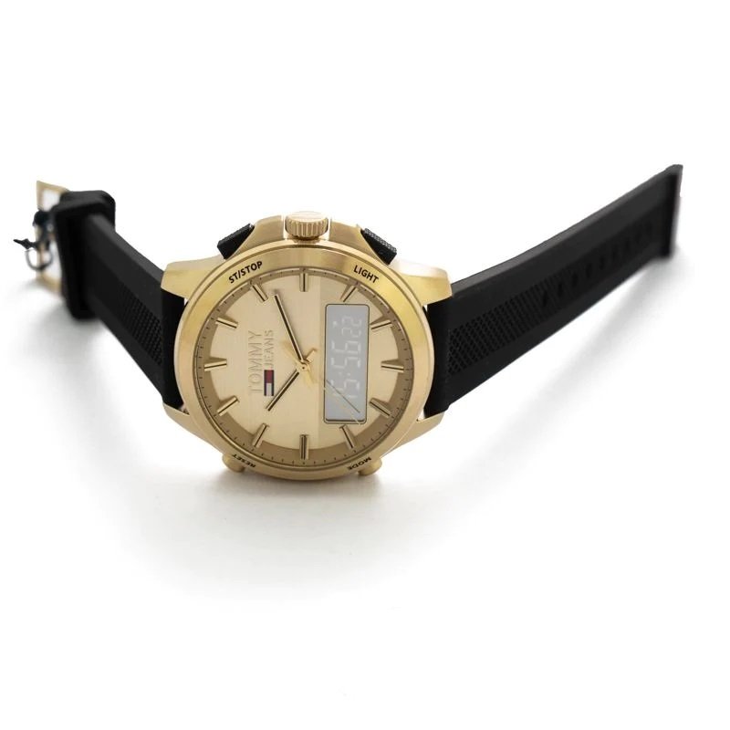 ساعة تومي هيلفيغر Tommy Hilfiger للرجال أصلية موديل 1791762 Jeans لون ذهبي و استيك سيليكون مطاط لون اسود.