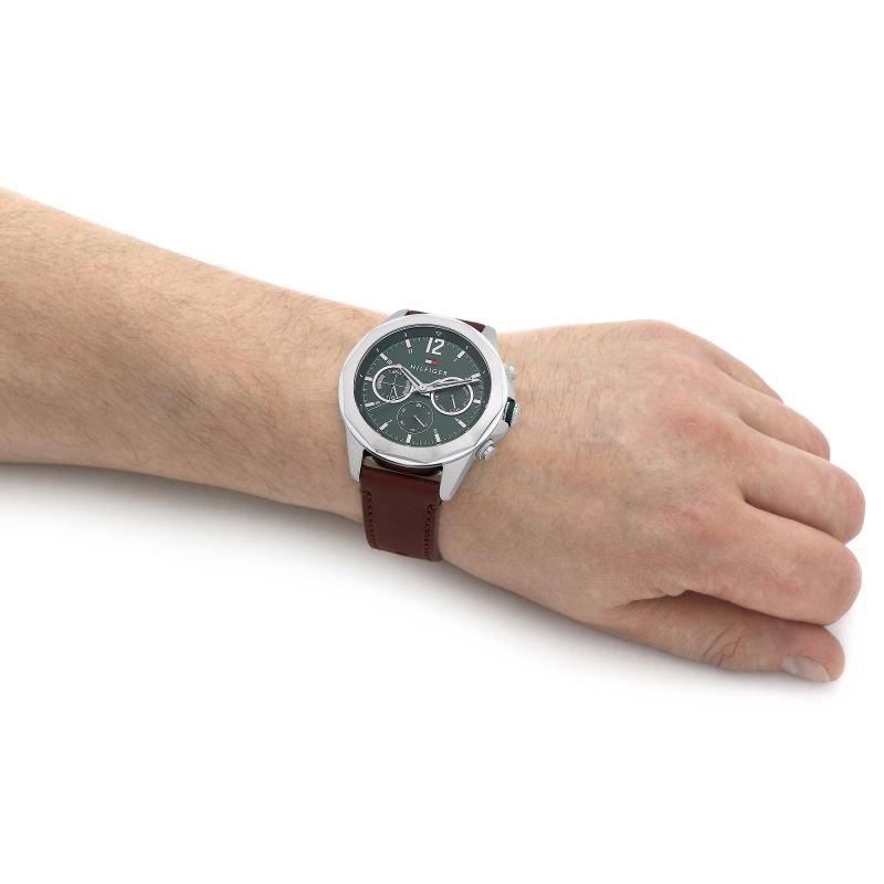 ساعة تومي هيلفيغر اصلية للرجال موديل 1792064 لون اخضر واوستيك جلد طبيعي لون بني.