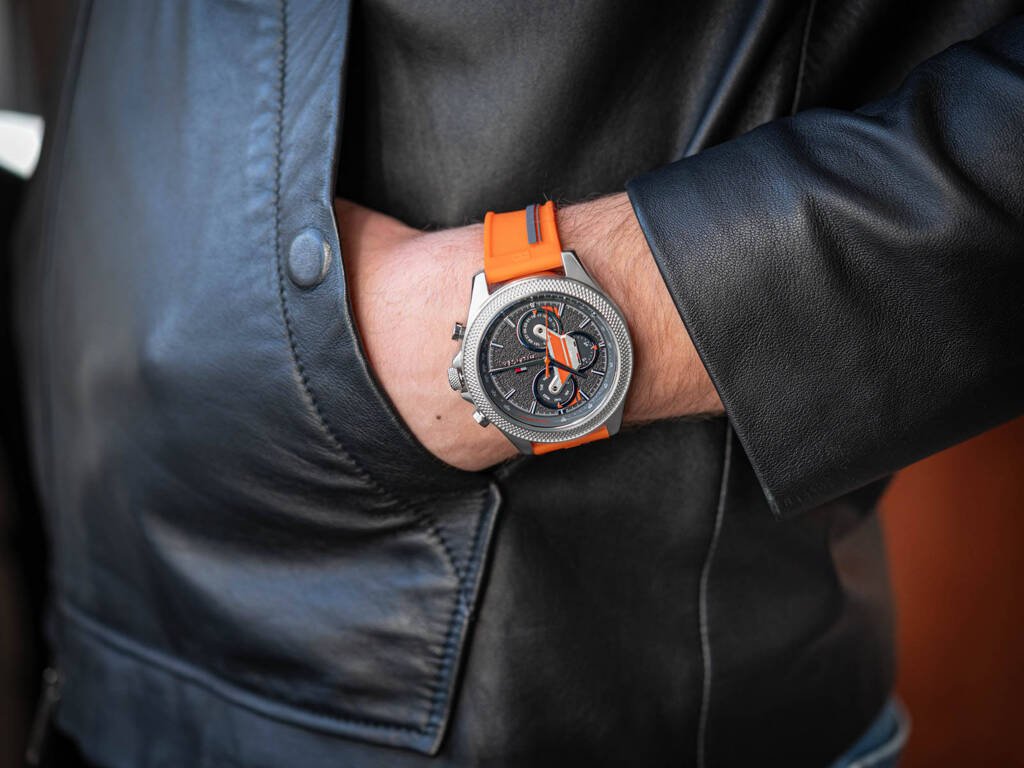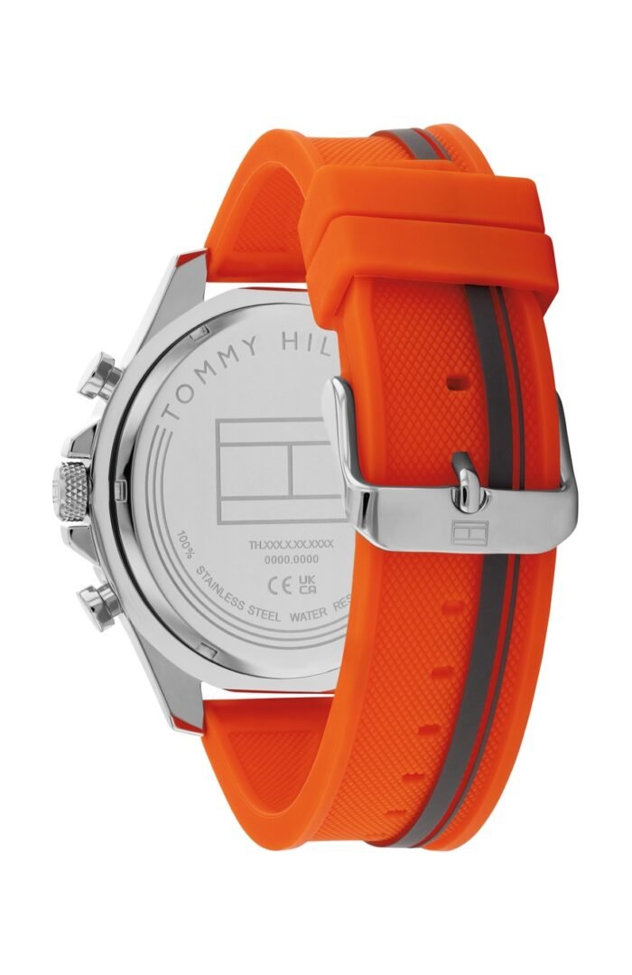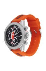 ساعة تومي هيلفيغر للرجال أصلية موديل 1792084 لون اسود و استيك سيليكون مطاط لون برتقالي.