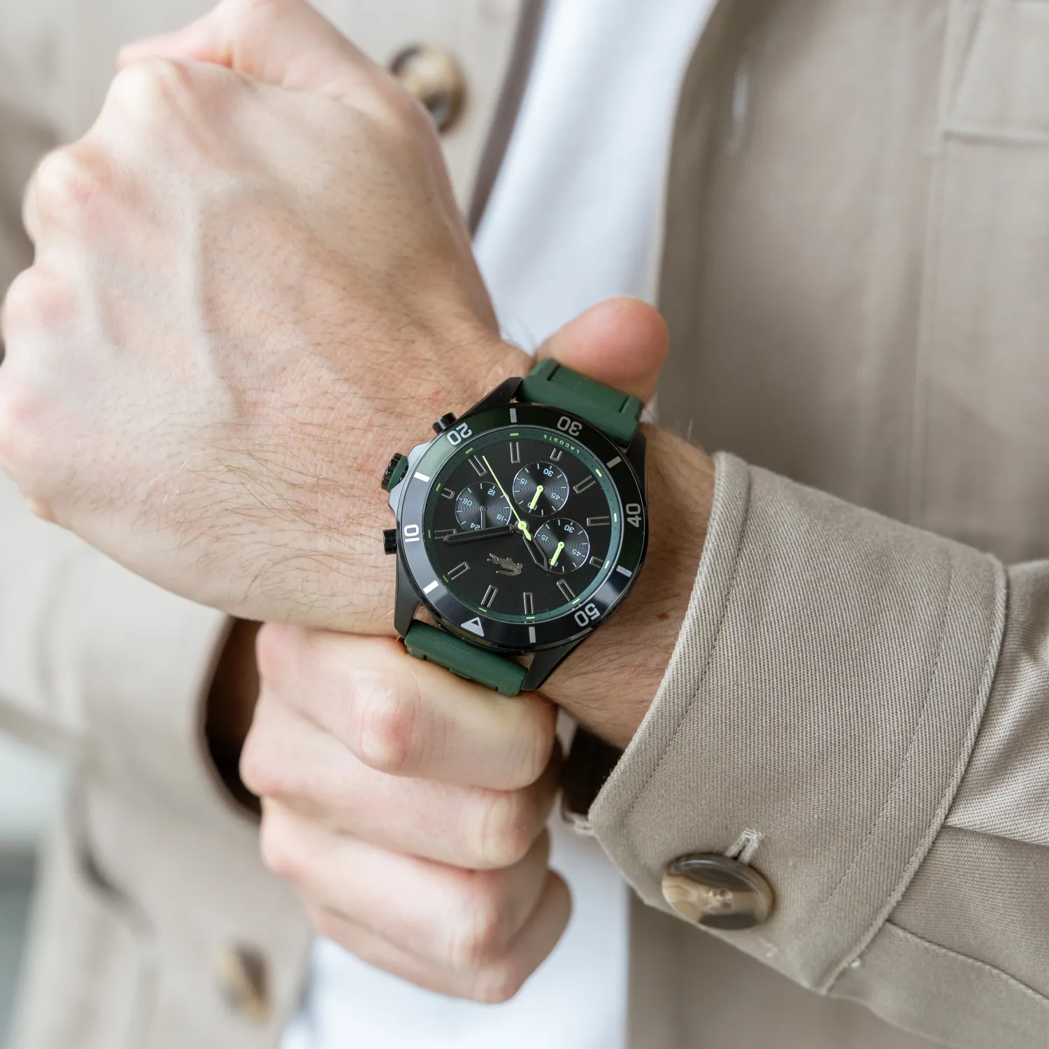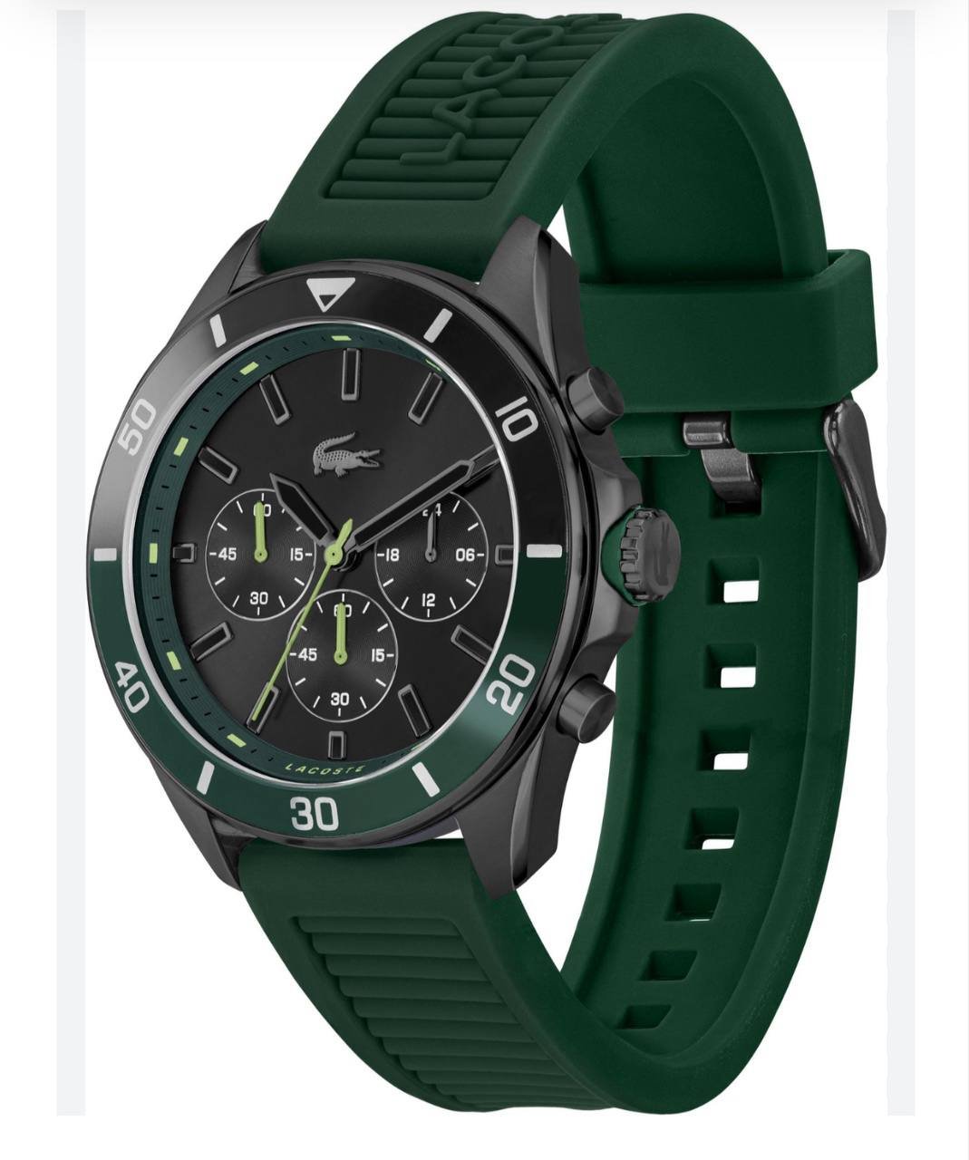 ساعة لاكوست Lacoste للرجال أصلية موديل TIEBREAKER 2011153 لون اسود و استيك سيليكون مطاط لون اخضر.