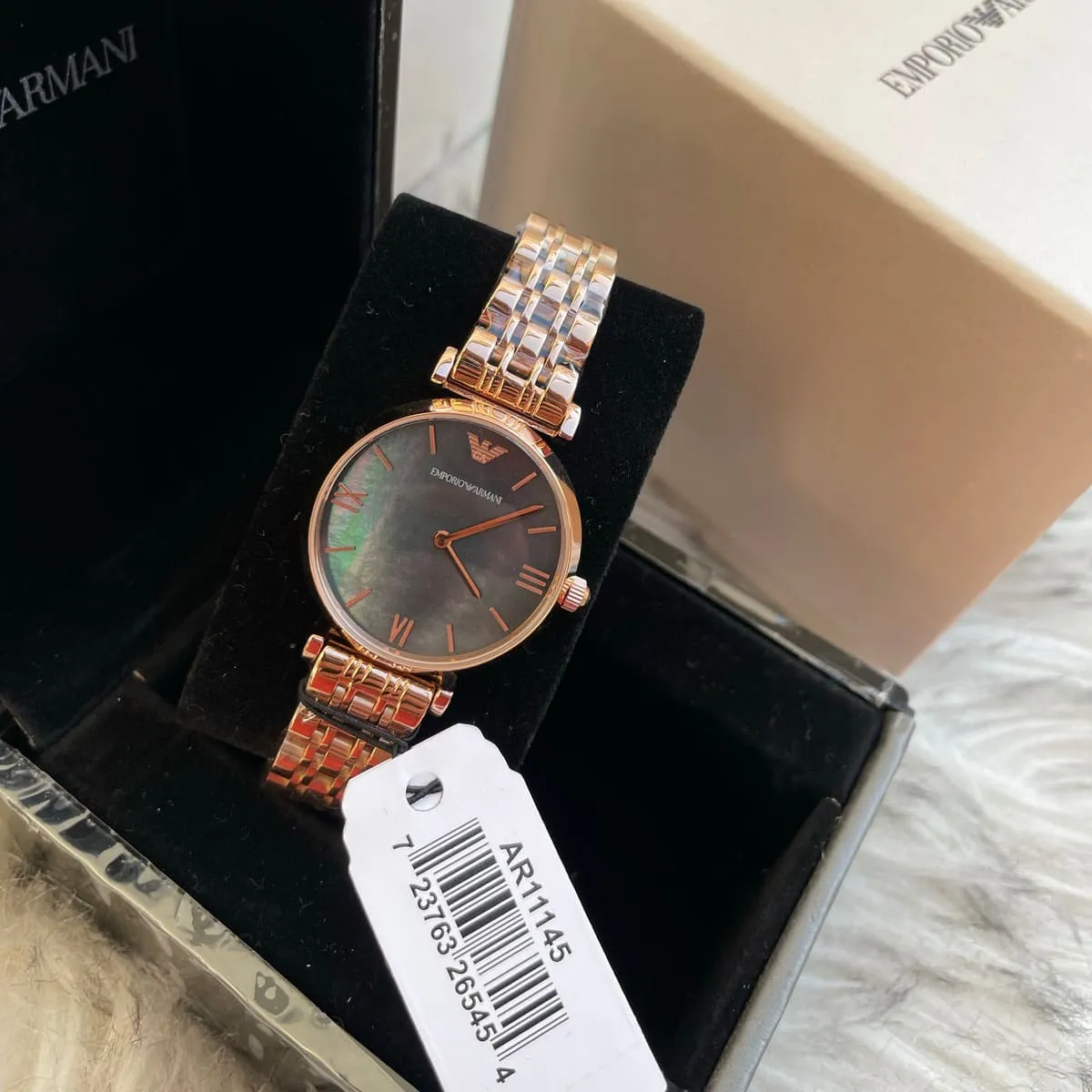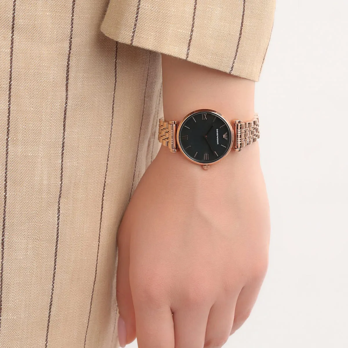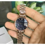ساعة إمبوريو أرماني للنساء اصلية موديل AR11145 لون اسود و استيك معدن ستانلس لون روز جولد.