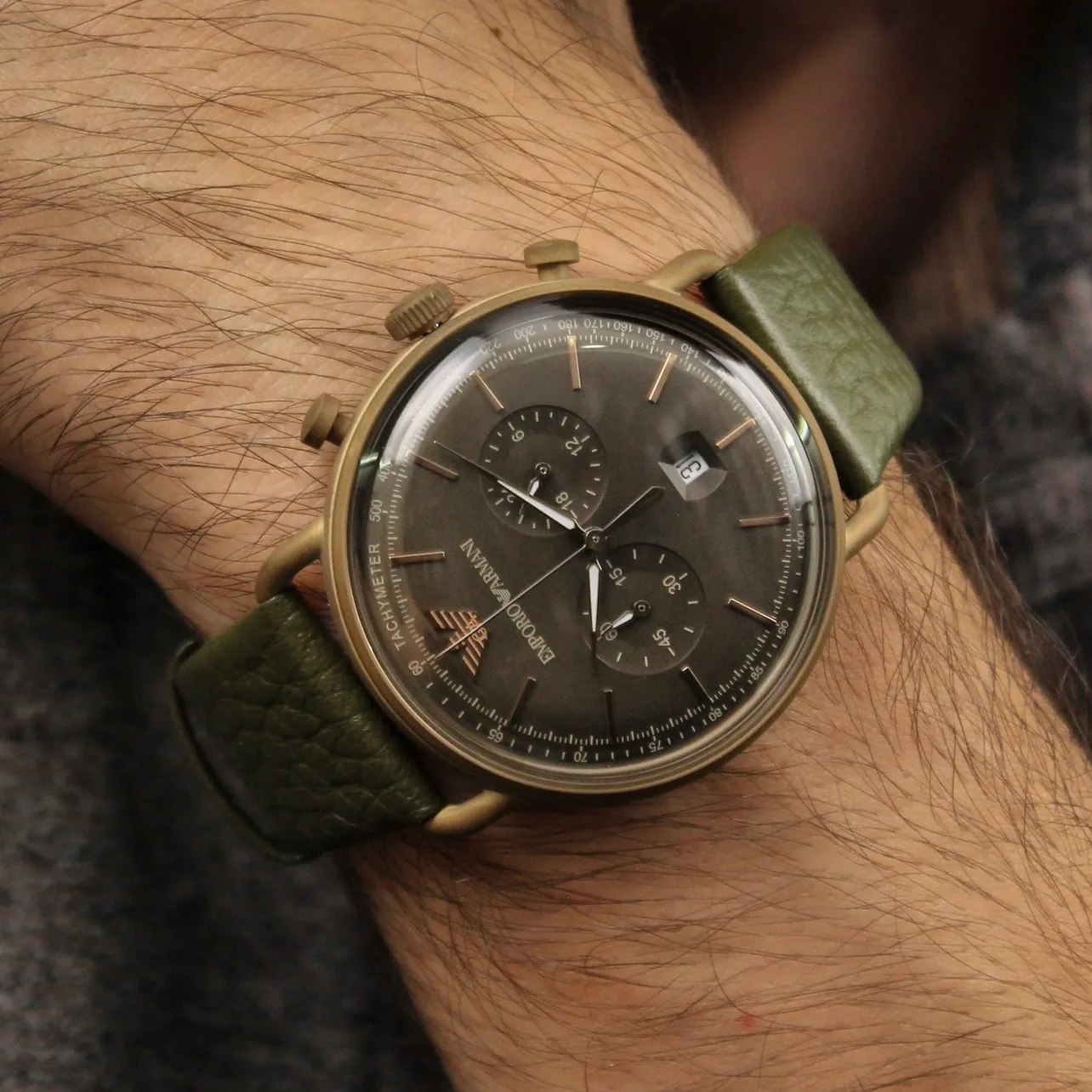 ساعة امبوريو ارماني Emporio Armani للرجال أصلية موديل AR11421 Aviator لون اخضر و استيك جلد طبيعي لون اخضر.