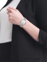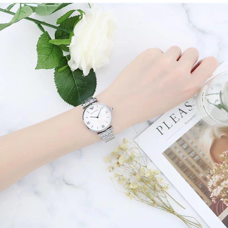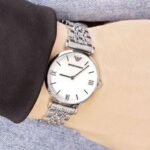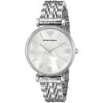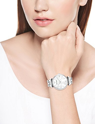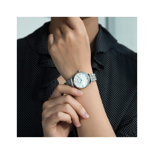 ساعة امبوريو ارماني للنساء اصلية موديل Gianni T-Bar AR1682 لون ابيض و استيك معدن ستانلس لون فضي.