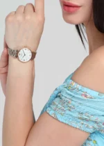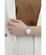 ساعة امبوريو ارماني للنساء اصلية موديل Gianni T-Bar AR1683 لون ابيض واستيك معدن ستانلس لون فضي * روز جولد.