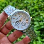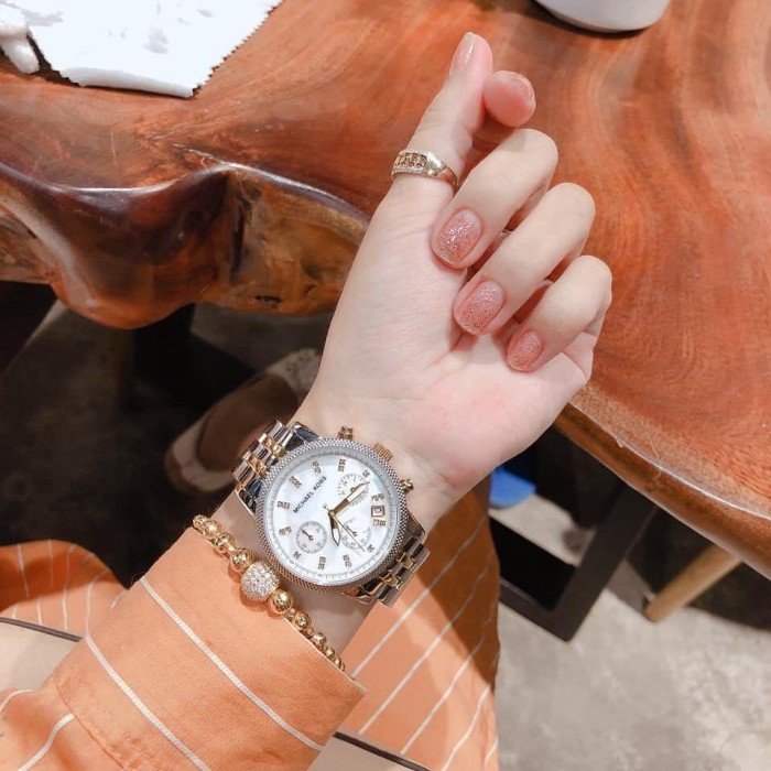 ساعة مايكل كورس للنساء أصلية موديل MK5525 لون ابيض و استيك معدن ستانلس لون فضي * ذهبي.