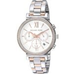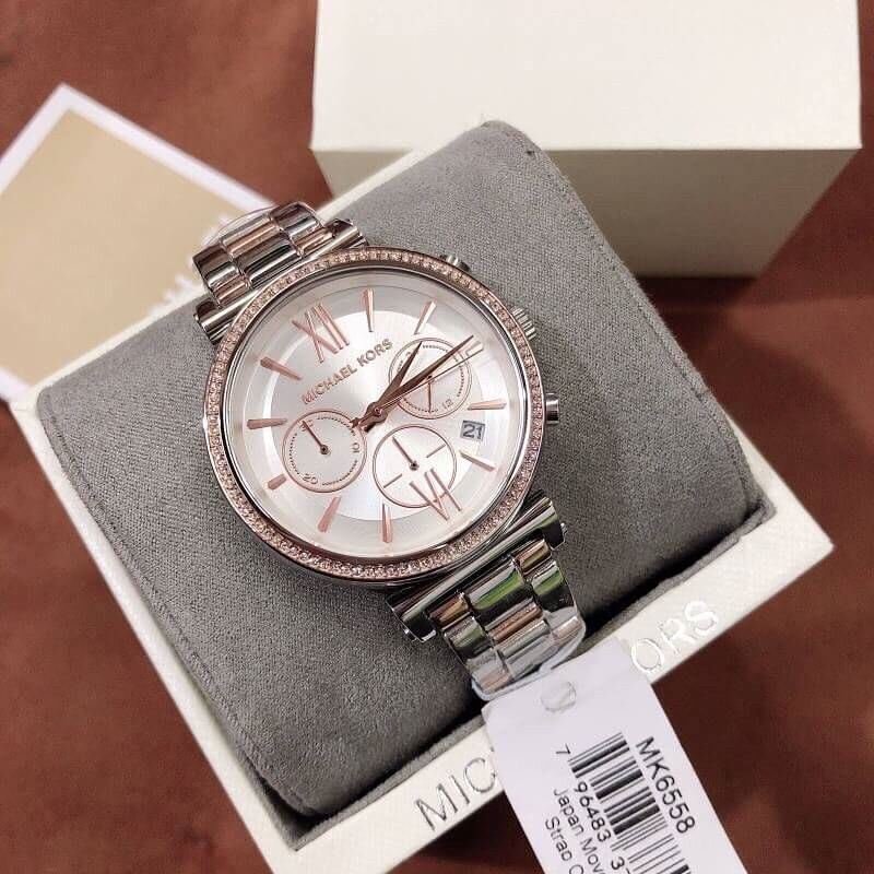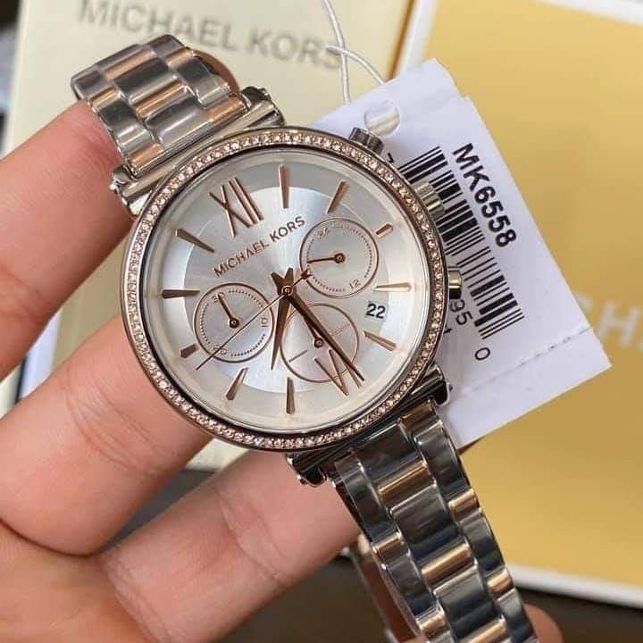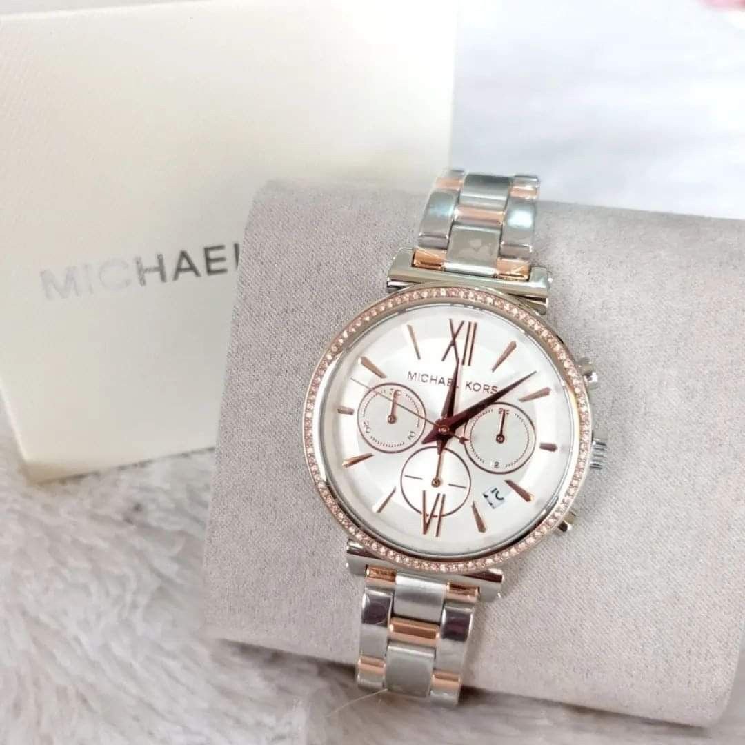 ساعة مايكل كورس للنساء اصلية موديل Sofie MK6558 لون ابيض واستيك معدن ستانلس لون فضي * روز جولد.