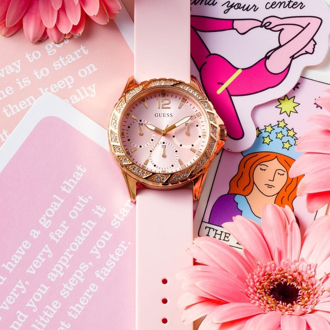 ساعة جيس Guess للنساء أصلية موديل W0032L9 لون وردي و استيك سيليكون مطاط لون وردي.